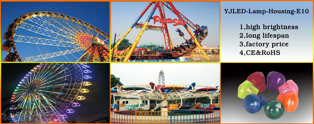 The Amusement LED Lamp Housing combine with E10 Amusement Bulb are applied for kinds of rides and equipment decoration. Such as the Farris Wheel, Carousel and so on.Turbo cover, 8 kinds of color, CE & RoHS approved.