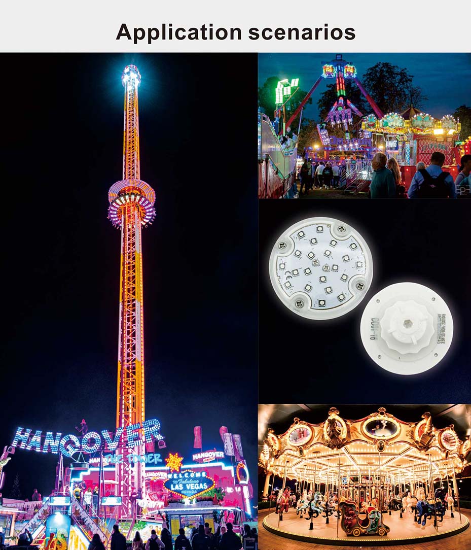 Amusement LED lamps are widely applied in amusement equipments in theme parks, such as Ferris Wheels, Roller Coasters, Carousels, Merry-go-rounds, Wheel Rides, Tower Rides, Flume Rides and Water Rides.